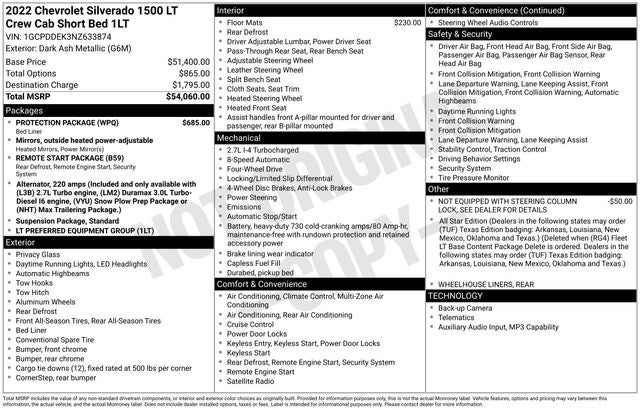 - Convenience Package includes (CJ2) dual-zone automatic climate control, (A2X) 10-way power driver seat including power lumbar, (KA1) heated driver and passenger seats, (NP5) leather-wrapped steering wheel, (KI3) heated steering wheel, (N37) manual tilt/telescoping steering column, (KI4) 120-volt power outlet, (KC9) 120-volt bed-mounted power outlet, (UBI) 2 charge-only USB ports for second row, (C49) rear-window defogger, (AVJ) Keyless Open and Start, (BTV) Remote Start and (UTJ) content theft alarm. (Upgradeable to (A50) bucket seats and includes (D07) center console. Deleted when (RG4) Fleet LT Base Content Package Delete is ordered. Vehicles built prior to 3-14-2022 and after 4-24-2022 include heated driver and front outboard passenger seats. Certain vehicles built on or after 3-14-2022 through 4-24-2022 will be forced to include (00V) Not Equipped with Heated or Ventilated Front Seats, which removes heated front seats. Vehicles equipped with (00V) Not Equipped with Heated or Ventilated Front Seats will be eligible for later dealer retrofit to enable functionality. Certain vehicles built prior to 3-28-2022 may be forced to include (00G) Not Equipped with Heated Steering Wheel, which removes the heated steering wheel. See dealer for details or the window label for the features on a specific vehicle.)
